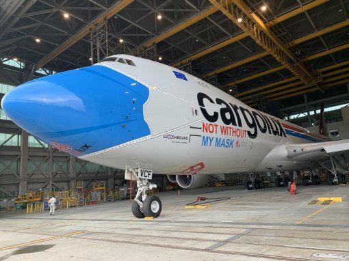 A Cargolux, uma das maiores empresas aéreas de cargas da Europa, revelou uma pintura especial aplicada em um de seus Boeing 747-8F, que passou a usar uma enorme máscara azul no nariz.
