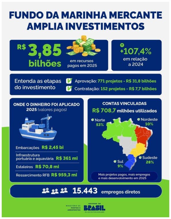 O Fundo da Marinha Mercante (FMM) destinou R$ 3,85 bilhões ao setor naval e aquaviário no ano de 2025, para ampliar os investimentos na construção de embarcações, na infraestrutura portuária e aquaviária e no fortalecimento da indústria naval brasileira. Com os recursos, houve impacto direto na geração de empregos, no fortalecimento da cadeia produtiva e na modernização do transporte aquaviário. Os valores também representaram crescimento de 107,4% em relação a 2024.