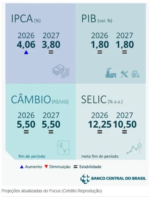 A primeira pesquisa Focus do ano mostra que os analistas consultados pelo Banco Central projetam para 2026 uma desaceleração da inflação e também da atividade econômica no ano, ao passo que mantêm a expectativa de cortes na taxa básica de juros, a Selic.