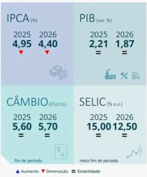 Para o câmbio, também ficaram inalteradas as projeções de dólar a R$ 5,60 ao fim de 2025 e com cotação de 5,70 ao fim de 20216.