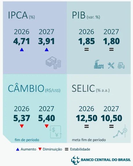 Para a Selic, o mercado mantém a projeção de que o ano termina com o patar dos juros a 12,50%, ainda que tenha elevado a inflação. O mercado também mantém o PIB com alta de 1,85% no ano. Para 2027, a perspectiva para o PIB segue em alta de 1,8%.
