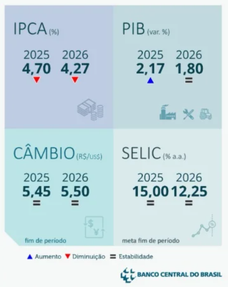 Para a alta do Produto Interno Bruto (PIB), a estimativa para 2025 subiu de 2,16% para 2,17%, permanecendo em 1,80% para 2026.
