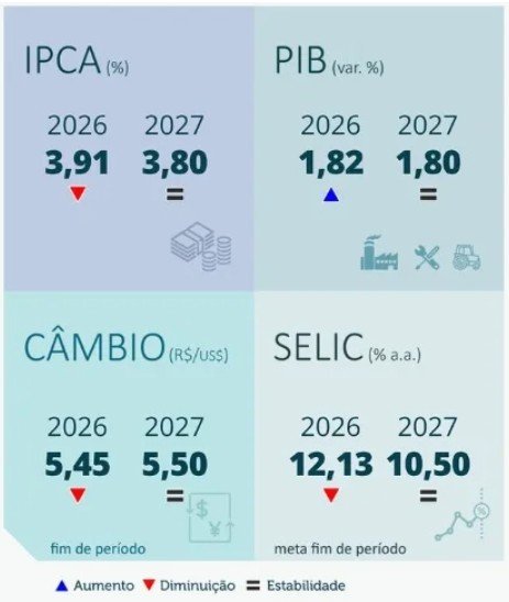 Para 2027, a projeção da inflação se manteve em 3,8%. Para 2028 e 2029, as estimativas são de 3,5% para os dois anos.