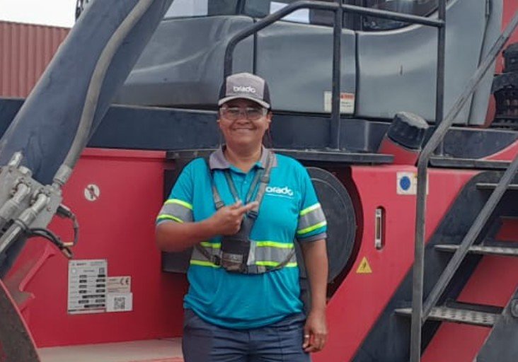 Deborah Lopes, operadora de empilhadeira reach stacker da Brado Logística - Foto: Brado Logística - Divulgação