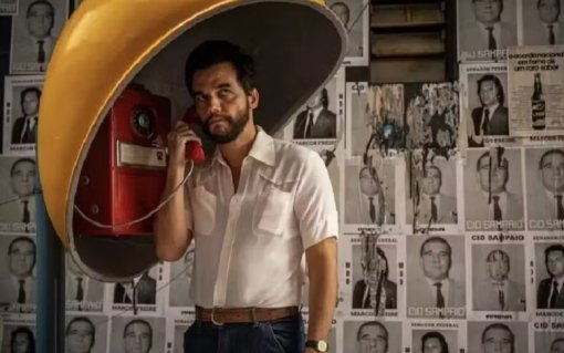Na imagem, Marcelo, personagem vivido por Wagner Moura, surge dentro da cabine oval segurando um telefone público.