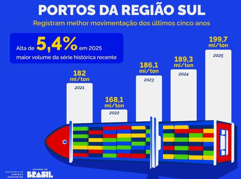 A região portuária do Sul do Brasil registrou, em 2025, a movimentação de quase 200 milhões de toneladas, um aumento de 5,4% em relação ao ano anterior, tendo o melhor desempenho dos últimos cinco anos. Os dados, divulgados pela Agência Nacional de Transportes Aquaviários (Antaq), contabilizam tanto a operação de portos públicos (129 milhões de toneladas) quanto de terminais de uso privado (69,9 milhões de toneladas).
