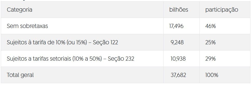 Outros 25% (US$ 9,3 bilhões) passam a estar sujeitos à tarifa global de 10%. Aplicado com base na Seção 122 da Lei de Comércio de 1974, o percentual pode subir para 15% conforme o governo estadunidense.