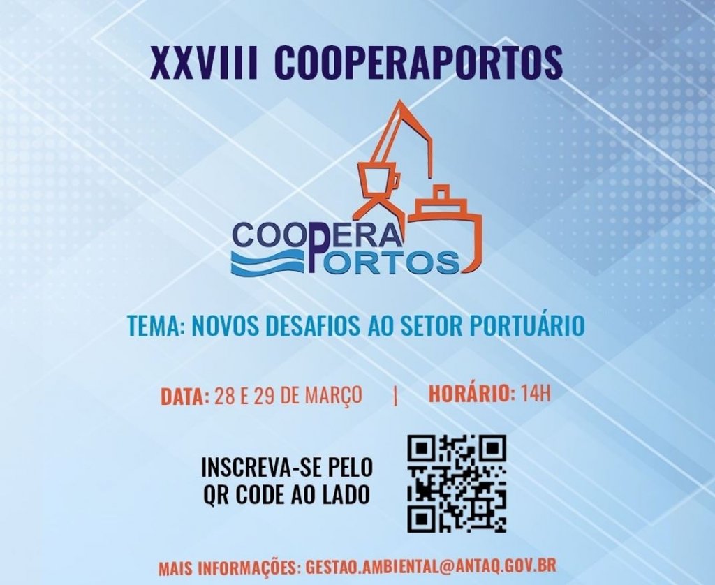 “Novos Desafios ao Setor Portuário” é o tema do XXVIII CooperaPortos, que será realizado nos próximos dias 28 e 29, pela Agência Nacional de Transportes Aquaviários - Antaq e a Empresa Maranhense de Administração Portuária (Emap-Porto do Itaqui). O encontro deste ano propõe abrir o diálogo entre gestores e autoridades portuárias, Antaq, academia, autoridade marítima, autoridade ambiental e com o público em geral sobre assuntos que gerem impacto sobre as atividades dos portos no Brasil.