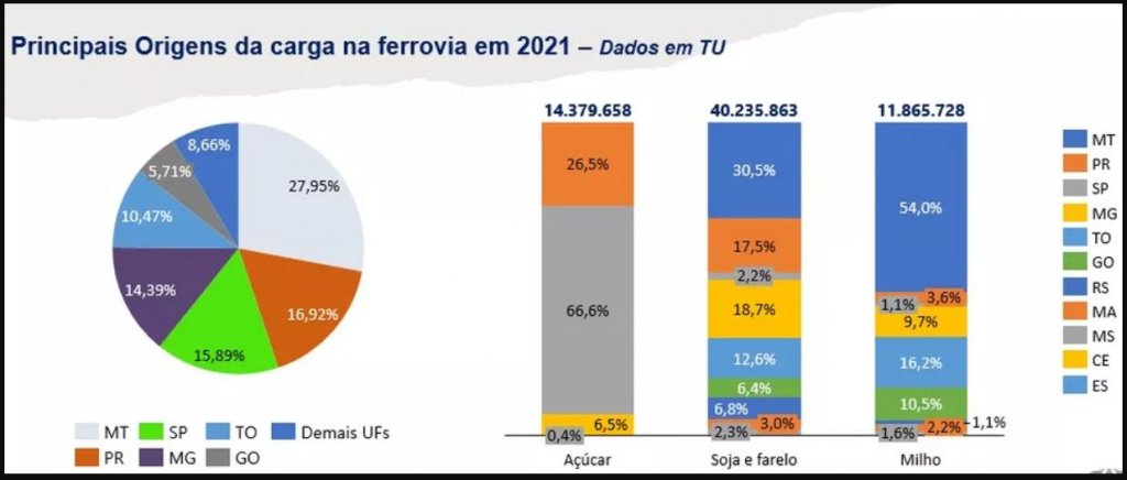 No país, em 2021, o transporte ferroviário foi responsável por mais de 46% da soja e farelo, 58% do milho e aproximadamente 53% do açúcar entregue aos portos brasileiros.