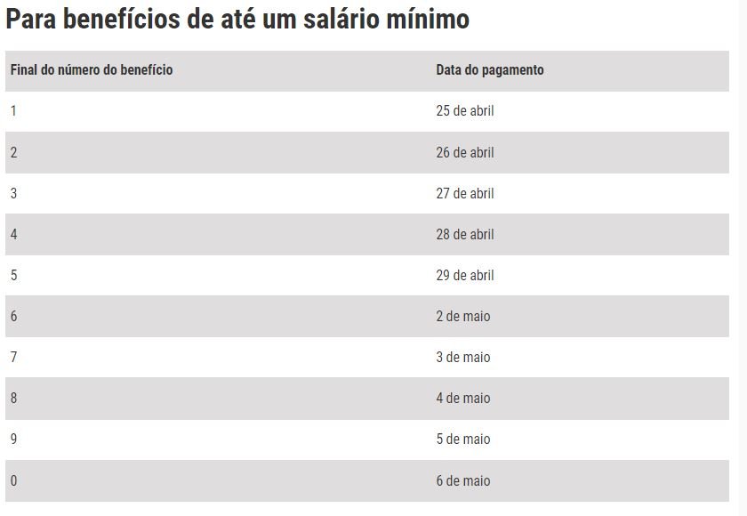 As datas variam de acordo com o valor da aposentadoria, pensão ou auxílio e o número final do benefício, sem considerar o dígito. Se o número do benefício é 123.456.789 – 0, por exemplo, não considere o “0”. O número final é 9. Veja as datas: