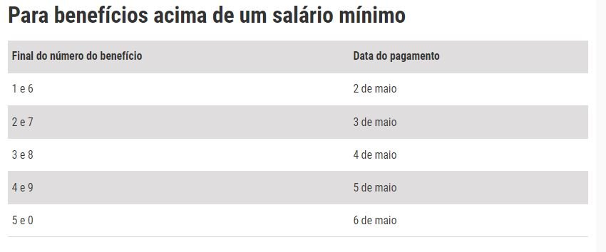 Para quem ganha acima de um salário mínimo, os depósitos começam em 2 de maio. Todos os segurados vão receber a primeira parcela até o dia 6 do mês que vem.