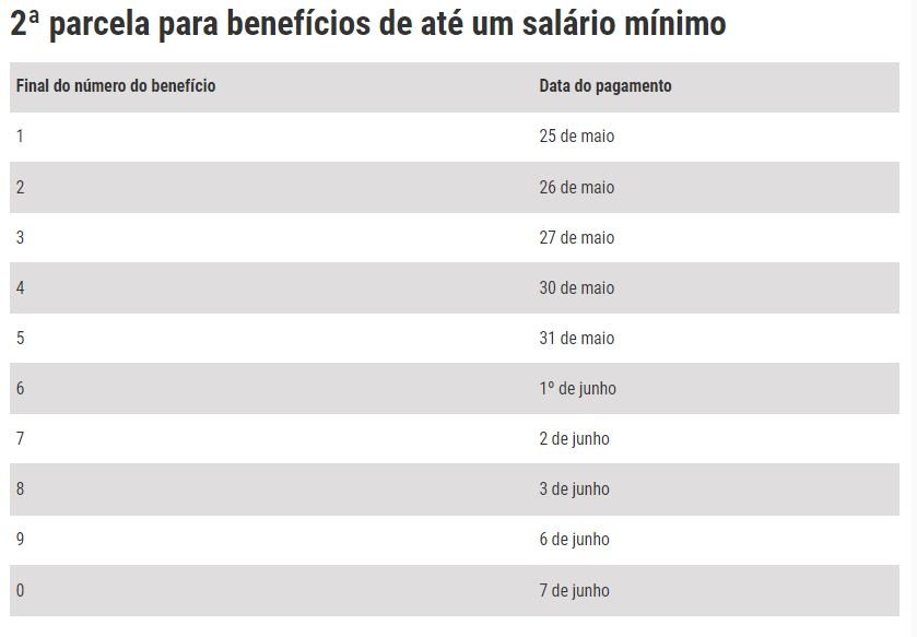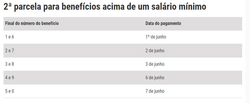 A segunda parcela do 13º salário será paga entre 25 de maio e 7 de junho, também de acordo com o valor que recebe e o número final do benefício. Na segunda parcela, porém, pode haver desconto do Imposto de Renda. Veja as datas: