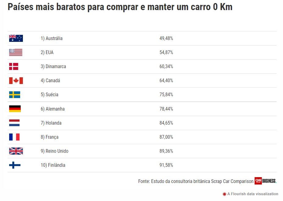 Enquanto ficamos com uma das piores colocações do ranking, só podemos imaginar como é a vida de quem mora nos 10 países onde é mais barato comprar e manter um automóvel novo. É o caso dos Estados Unidos, onde a aquisição e manutenção do 0 km representa apenas 54,87% da renda média anual dos trabalhadores. E os norte-americanos nem encabeçaram a lista. A Austrália ficou na frente. Por lá, comprar um carro novo compromete 49,48% do que um trabalhador ganha em um ano.
