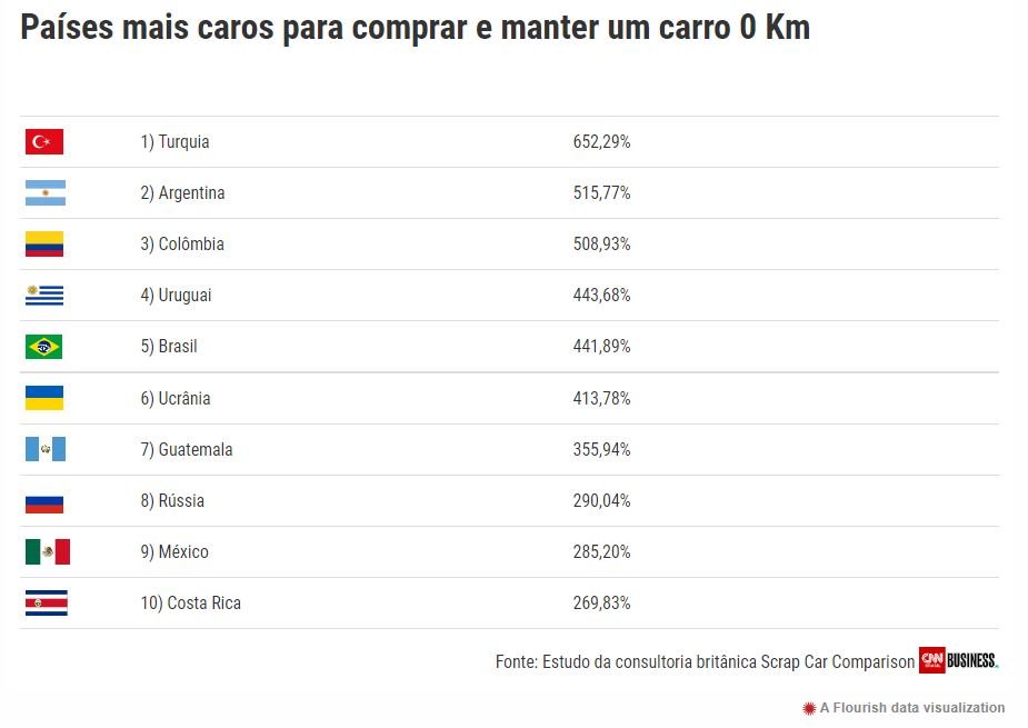 Quem encabeça a lista dos países mais caros para se adquirir um veículo 0 km é a Turquia, onde o preço médio do automóvel novo representa 652,29% do rendimento anual médio de um trabalhador naquele país.