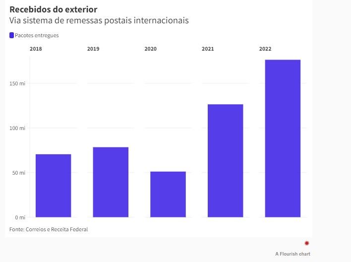 Cinco encomendas internacionais por segundo. Esse foi o volume das compras feitas por brasileiros nas plataformas de comércio eletrônico em 2022. O dado é dos Correios e revela que o país recebeu exatos 176.276.519 volumes de compras do exterior. Isso equivale a uma média de 20 mil encomendas por hora ou 482,9 mil por dia – incluindo sábados, domingos e feriados.