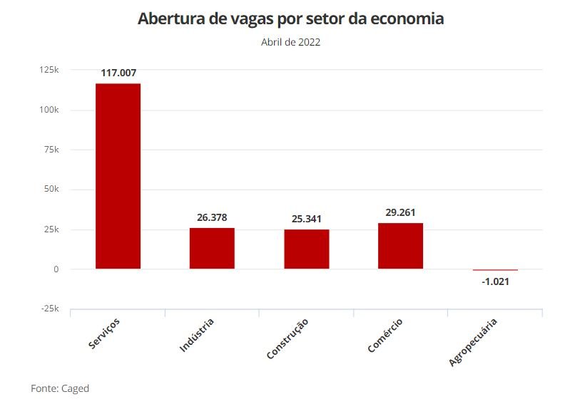 Os números do Caged de abril de 2022 mostram que foram criados empregos formais em quatro dos cinco setores da economia. Houve demissões na agropecuária.