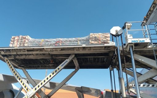Para o transporte do primeiro lote, foram movimentadas cerca de 48 toneladas de materiais em tempo recorde, a fim de atender a urgência imposta pelo cronograma de obras. Além das dimensões da carga, tipicamente pesadas e volumosas, as propriedades geométricas das peças contrariavam a logística aérea padrão, representando um desafio adicional à exportação. Atravessaram o céu do Atlântico tubos de proteção anti-vandalismo e elementos estruturais que excederam os seis metros de comprimento.
