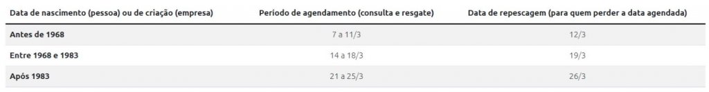 O calendário de agendamento do resgate e a data de repescagem ficou da seguinte forma: