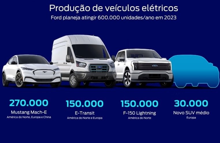 Os destaques elétricos da produção da Ford para 2023 serão: 270.000 unidades do Mustang Mach-E para a América do Norte, Europa e China; 150.000 do F-150 Lightning para a América do Norte; 150.000 da Transit elétricas para a América do Norte e Europa; e 30.000 unidades de um novo SUV para a Europa.