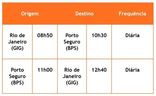 Os voos regulares, diretos e diários partem do Aeroporto Internacional do Galeão, permitindo aos passageiros um acesso rápido e cômodo às paisagens paradisíacas do litoral sul da Bahia, como as de Arraial d’Ajuda, Santa Cruz Cabrália, Caraíva, Trancoso e Praia do Espelho, entre outros.