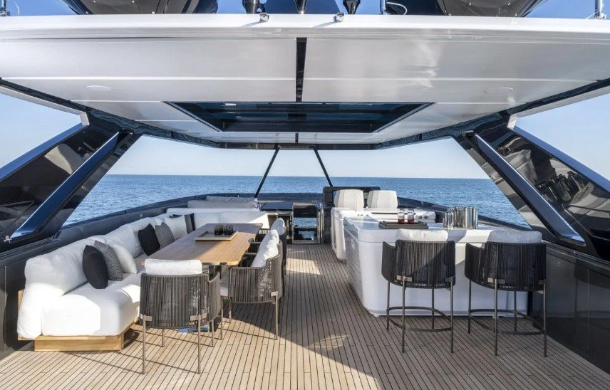O flybridge tem cerca de 50 m². Seu layout contempla lounge, mesa para refeições e cozinha gourmet, com opção de hard top fixo ou lâminas móveis. Na proa, o solário e o lounge em formato “C” complementam os espaços de convivência.
