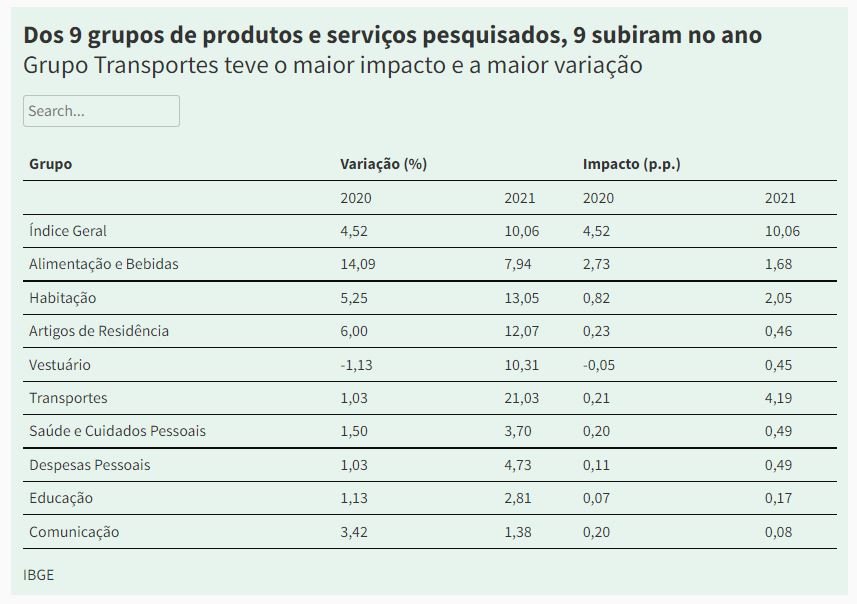Em seguida, vieram Habitação (13,05%), que contribuiu com 2,05 p.p., e Alimentação e bebidas (7,94%), com impacto de 1,68 p.p. Juntos, os três grupos responderam por cerca de 79% do IPCA de 2021, diz o IBGE.