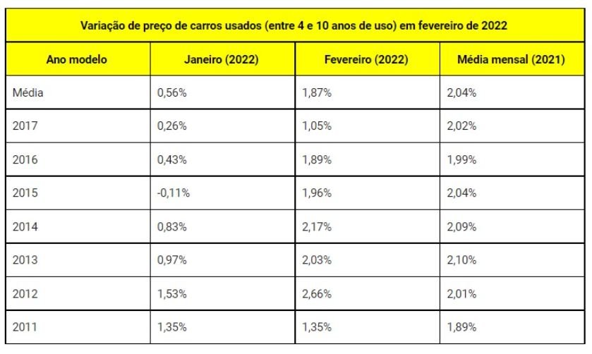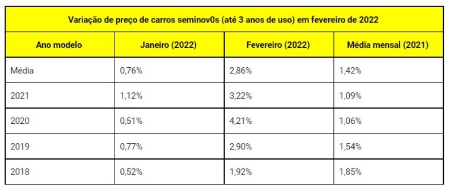 Em relação aos seminovos, com até três anos de uso, aqueles com ano modelo 2020 foram os que mais subiram de preço em fevereiro: 4,21% em média, número que deixa esses veículos bem acima da variação apresentada em 2021, quando a alta foi de, em média, 1,06% ao mês.