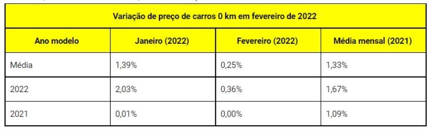 Os preços de veículos 0km apresentaram uma variação de +0,36% nos modelos 2022, enquanto os 2021 não tiveram variação expressiva. Esse cenário é inferior ao demonstrado durante todo o ano de 2021, quando os modelos 2022 variaram 1,67% e os modelos 2021 1,09% em média por mês.