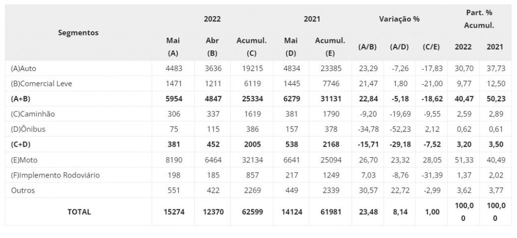 Com o resultado de maio, as concessionárias de Salvador fecharam os cinco primeiros meses do ano com um total de 62.599 veículos vendidos – crescimento de 1% ante o mesmo período de 2021. Na tabela abaixo os dados do setor, na Bahia: