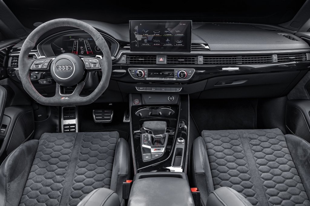 O interior possui detalhes como sistema de iluminação “Audi Beam”, que projeta o símbolo Audi Sport no piso ao abrir as portas dianteiras; volante e câmbio revestidos em Alcântara com costura em vermelho; couro Nappa com costura contrastante no apoio de braço das portas e console central; e tapetes na cor preta com costura contrastante em vermelho e logotipo RS – nos frontais.