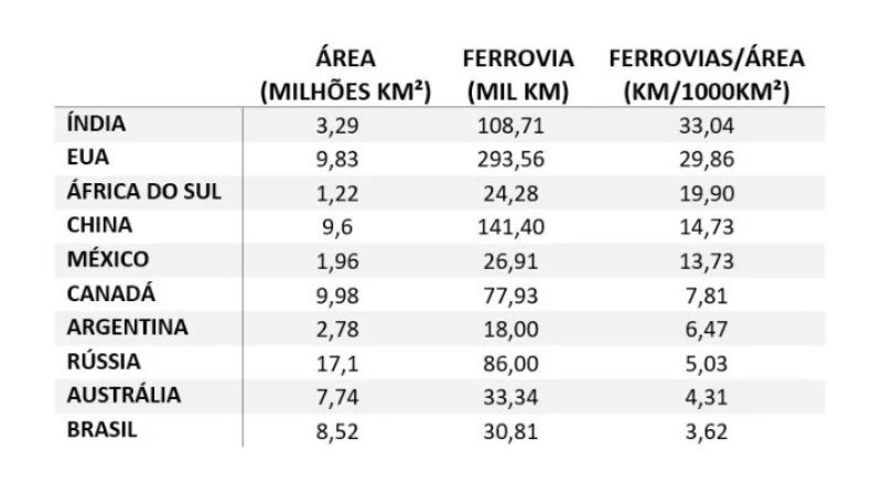 Veja o comparativo das densidades de malhas ferroviárias de vários países: