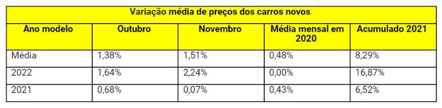 Em outubro o MVP registrava acréscimo médio de 1,38% para os preços dos carros novos. Destacando somente os modelos 2022, o índice médio de variação passou de 1,64% há dois meses para 2,24% no mês passado.