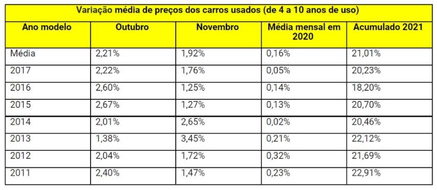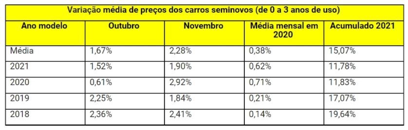 Para os veículos seminovos, com até três anos de uso, há também uma tendência de alta. Em média, os aumentos passaram de 1,67% para 2,28% nos últimos dois meses, chegando ao pico de 2,92% para os carros 2020 em novembro.