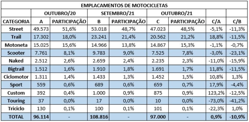 Os licenciamentos em outubro somaram 97 mil unidades. O volume é 10,9% inferior ao registrado em setembro (108.816 motocicletas) e 0,9% maior na comparação com as 96.114 motocicletas emplacadas no mesmo mês do ano passado.