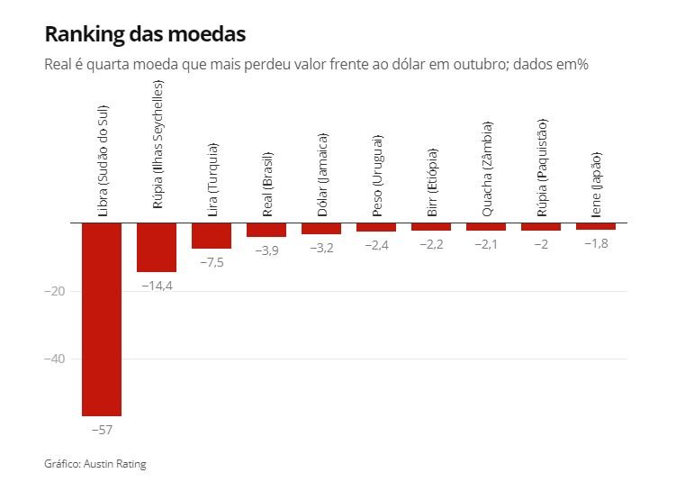 No acumulado do ano, o real ocupa o posto de 14ª moeda que mais perdeu valor, segundo o levantamento da Austin Rating, com uma desvalorização de 9% em relação ao dólar.