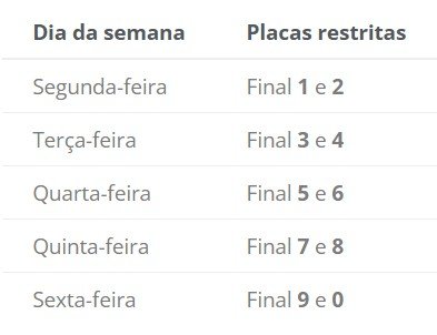 Para cada dia da semana, há restrição conforme a numeração final da placa dos veículos. O esquema funciona da seguinte forma: