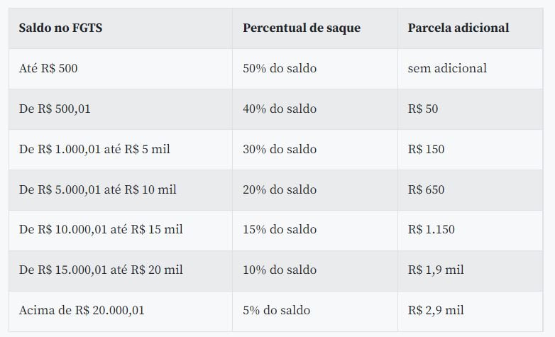 O valor a que o trabalhador que aderiu ao saque-aniversário tem direito a retirar a cada ano depende do saldo em cada conta do FGTS. Para contas com saldo de até R$ 500, poderá ser retirado 50% do total. A partir daí, o percentual cai, mas será paga um valor fixo adicional, que aumenta conforme o saldo total. O cálculo ocorre da seguinte forma.