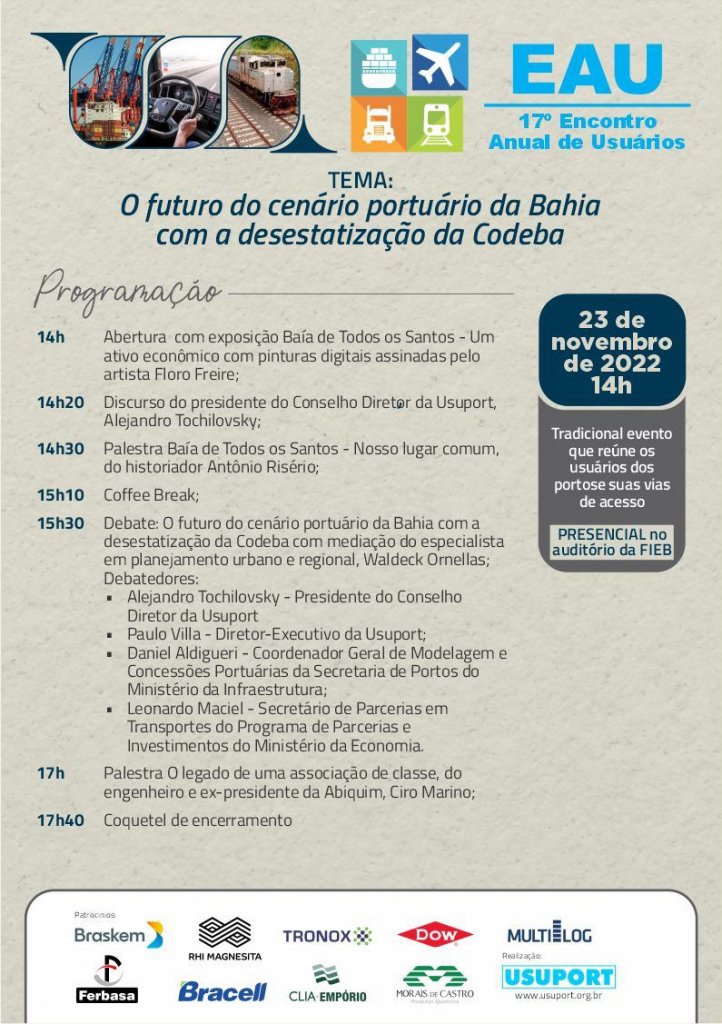 A programação inclui um debate entre os representantes dos usuários, o presidente do Conselho Diretor e o diretor-executivo da Usuport, Alejandro Tochilovsky e Paulo Villa, respectivamente; Daniel Aldigueri, coordenador geral de Modelagem e Concessões Portuárias da Secretaria de Portos do Ministério da Infraestrutura; e Leonardo Maciel, secretário de Parcerias em Transportes do Programa de Parcerias e Investimentos do Ministério da Economia. O debate será mediado pelo especialista em planejamento urbano e regional, ex-senador e ex-ministro Waldeck Ornellas.