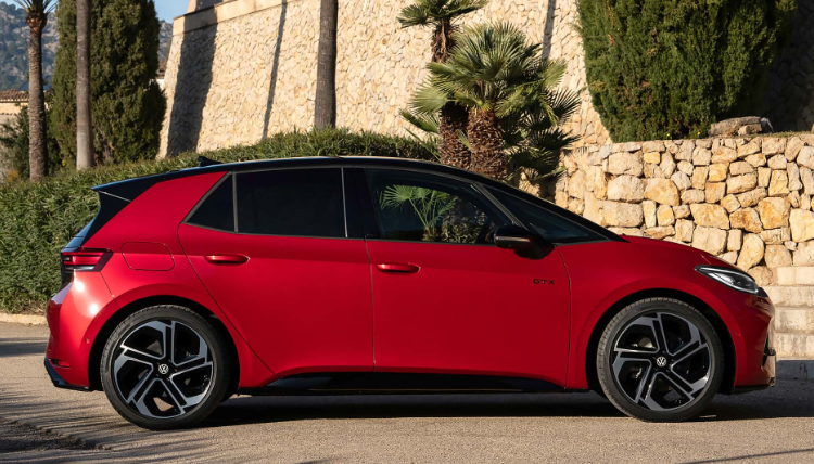 O interior tem muitos detalhes em vermelho. Há bancos dianteiros esportivos com ajuste elétrico e apoios de cabeça integrados, emblema GTX e tecido feito de material reciclado. Todos os ID.3s terão uma nova multimídia de 12,9 polegadas e uma alavanca seletora de modo de direção separada na coluna de direção. Antes tarde do que nunca, os controles sensíveis ao toque para o volume e o ar-condicionado finalmente estão iluminados, como no recém-lançado Golf Mk8.5.