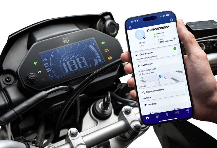 No painel da Lander 2026, o condutor pode acompanhar notificações de chamadas e mensagens recebidas, além do nível de bateria do celular conectado e o status da conexão com o aplicativo. O modelo vem equipado com uma tomada 12V posicionada acima do painel.